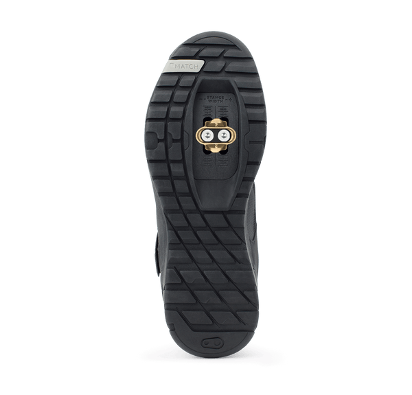 La bande de roulement est conçue pour la traction hors du vélo. Les crampons aux orteils et au talon orientés et espacés offrent une traction pour la randonnée sur des terrains escarpés. Le bout incliné permet de marcher sur des terrains escarpés.