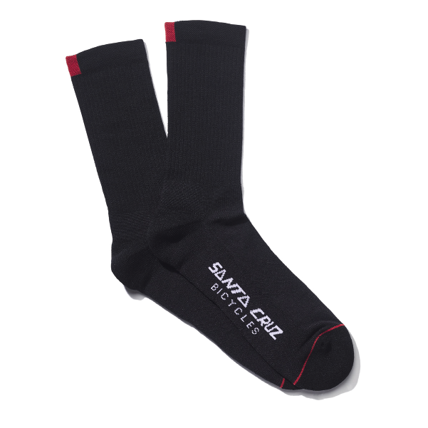 Nos chaussettes de vélo incontournables avec un bloc rouge classique Santa Cruz.